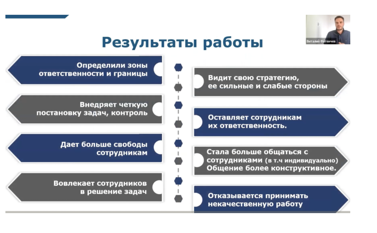 «Мы порядка трех часов подряд, достаточно глубоко работали лично с собственником. Нашли стратегии мышления, которые приводили к излишнему фокусу собственника на своих задачах и сложности с делегированием. В „зоне гения“ увидели, что на самом деле СЕО — это лидер, лидер слышащий и чувствующий людей. И на этом построили новый формат взаимодействия с командой» — делится Виталий.